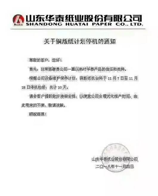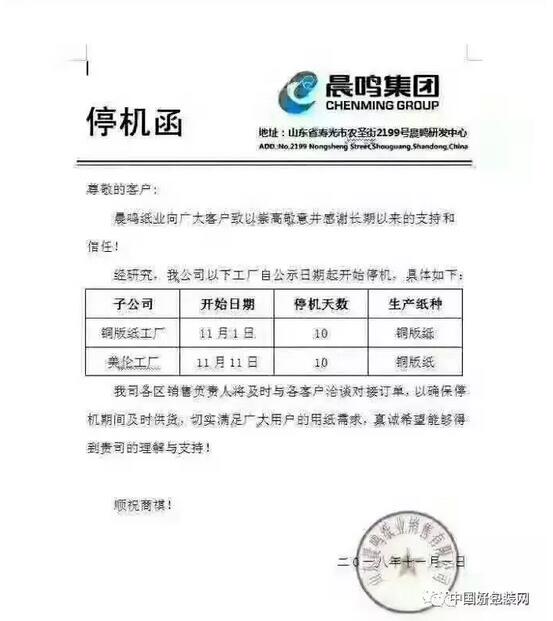 自11月1日起,銅版紙工廠停機10天;11月11日起,美倫工廠停機10天。