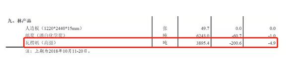 回到解放前,高瓦即將跌破3000元/噸大關(guān)! 11月5日,國(guó)家統(tǒng)計(jì)局發(fā)布《流通領(lǐng)域重要生產(chǎn)資料市場(chǎng)價(jià)格變動(dòng)情況(2018年10月21-30日)》,據(jù)對(duì)24個(gè)省(區(qū)、市)流通領(lǐng)域9大類50種重要生產(chǎn)資料市場(chǎng)價(jià)格的監(jiān)測(cè)顯示,2018年10月下旬與10月中旬相比,18種產(chǎn)品價(jià)格上漲,28種下降,4種持平。 梳理發(fā)現(xiàn),根據(jù)統(tǒng)計(jì)局?jǐn)?shù)據(jù),10月下旬,高強(qiáng)瓦楞紙均價(jià)3895.4元/噸,比10月中旬價(jià)格下跌200.6元/噸,下跌4.9%。
