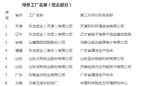 為持續(xù)打造綠色制造先進典型,引領(lǐng)相關(guān)領(lǐng)域工業(yè)綠色轉(zhuǎn)型,加快推動綠色制造體系建設(shè),工業(yè)和信息化部開展了第三批綠色制造名單推薦工作。經(jīng)申報單位自評價、第三方評價機構(gòu)評價、省級工業(yè)和信息化主管部門評估確認(rèn)及專家論證、公示等環(huán)節(jié),確定了第三批綠色制造名單,共計391家企業(yè)被評為綠色工廠,其中包括了山鷹、玖龍、太陽等8家紙企,詳情如下表所示:
