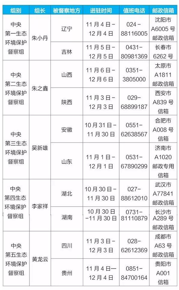根據(jù)安排,第二批“回頭看”進(jìn)駐時(shí)間為1個(gè)月。進(jìn)駐期間,各督察組分別設(shè)立專門值班電話和郵政信箱,受理被督察省份生態(tài)環(huán)境保護(hù)方面的來(lái)信來(lái)電舉報(bào),受理舉報(bào)電話時(shí)間為每天8:00-20:00。 第二批“回頭看”的五個(gè)組長(zhǎng)分別由朱小丹、朱之鑫、吳新雄、李家祥、黃龍?jiān)频任迦藫?dān)任,副組長(zhǎng)由四位生態(tài)環(huán)境部副部長(zhǎng)兼任。 第二批中央生態(tài)環(huán)境保護(hù)督察“回頭看”進(jìn)駐一覽表: