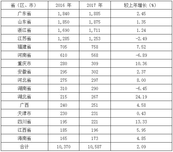 中國造紙協會發布《中國造紙工業2017年度報告》。報告顯示,2017年全國紙及紙板生產企業約2800家,全國紙及紙板生產量11130萬噸,其中箱板紙2385萬噸,瓦楞原紙2335萬噸。 2017年紙及紙板產量過百萬噸的省份有16個,分別為廣東、山東、浙江、江蘇、福建、河南、重慶、安徽、河北、湖南、湖北、廣西、天津、四川、江西和海南16個省(區、市),紙及紙板產量合計10587萬噸,占全國紙及紙板總產量的95.12%。 2017年紙及紙板產量100萬噸以上的省(區、市)