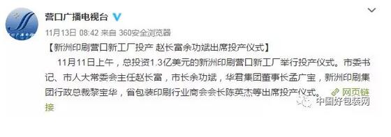11月11日上午,總投資1.3億美元的新洲印刷營口新工廠舉行投產(chǎn)儀式。新洲印刷集團成立于1946年,總部位于香港,在國內(nèi)印刷、包裝及紙品生產(chǎn)商行業(yè)內(nèi)擁有領(lǐng)導(dǎo)地位。