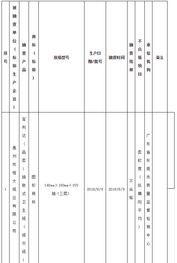 11月19日,廣東省市場監(jiān)督管理局官網(wǎng)公布2018年廣東省紙制品產(chǎn)品質(zhì)量“雙隨機”專項監(jiān)督抽查結(jié)果。本次抽查了廣東省內(nèi)95家企業(yè)生產(chǎn)的120批次紙巾紙、衛(wèi)生紙、濕巾、嬰兒紙尿褲、成人衛(wèi)生用品、醫(yī)護用紙衛(wèi)生床墊產(chǎn)品。經(jīng)檢驗,發(fā)現(xiàn)4批次產(chǎn)品不合格,不合格產(chǎn)品發(fā)現(xiàn)率為3.3%。不合格項目涉及“柔軟度(縱橫向平均)”“pH”“細菌菌落總數(shù)”3個項目。