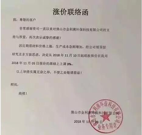 導(dǎo)語:11月26日,臨猗縣力達紙業(yè)有限公司再發(fā)漲價函,原紙再漲100元/噸。11月,漲價函滿天飛,在內(nèi)需不足、外需減弱的情況下,雪上加霜,大批中小型紙箱廠還能不能活過這個冬天?有業(yè)內(nèi)專家表示,今年冬天比較冷,明年春天倒春寒! 5天連發(fā)兩張漲價函,臨猗力達紙業(yè)原紙再漲100元/噸 11月26日,臨猗縣力達紙業(yè)有限公司再發(fā)漲價函: 公司決定原大軸原紙自2018年12月1日起價格每噸上調(diào)100元。