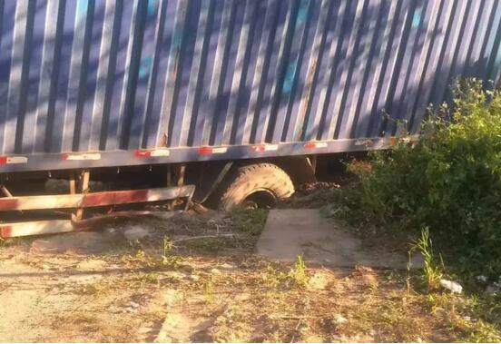 執法人員上前出示執法證件進行現場檢查,發現涉事貨車車身向左傾斜,左后輪深深陷入泥坑中,車底下墊了一塊紙皮,還有鐵鏟、千斤頂等工具,可見司機已實施過自救,但因貨車載物太重而無能為力。