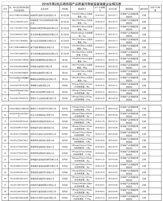 導語:11月26日,河南省質量技術監督局官網公布了2018年第2批瓦楞紙箱產品質量監督抽查結果,共抽查了99家企業生產的129批次瓦楞紙箱產品,1批次產品不符合標準要求,主要涉及邊壓強度、耐破強度等。