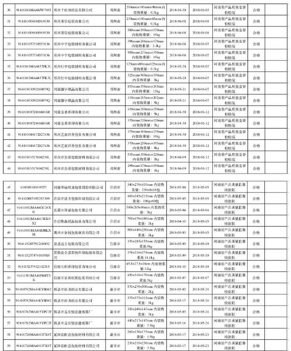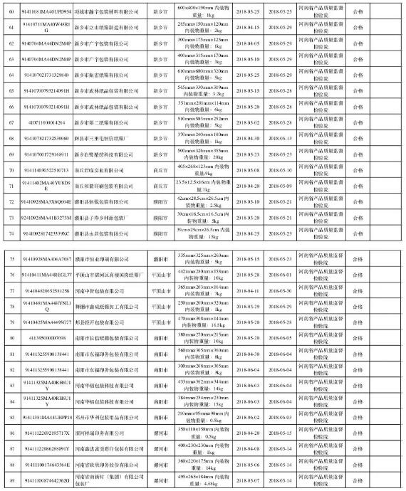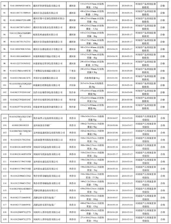 河南省質監局抽查99家企業129批次瓦楞紙箱產品,1批次產品不合格 11月26日,河南省質量技術監督局官網公布了2018年第2批瓦楞紙箱產品質量監督抽查結果,1批次產品不符合標準要求,主要涉及邊壓強度、耐破強度等。 本次抽查共抽取了鄭州、開封、洛陽、平頂山、安陽、鶴壁、新鄉、焦作、濮陽、許昌、漯河、三門峽、南陽、商丘、信陽、周口、駐馬店等15個省轄市和蘭考、汝州、鄧州、固始、新蔡等5個直管縣(市)99家企業生產的129批次瓦楞紙箱產品。 本次抽查依據GB/T6543-2008《運輸包裝用單瓦楞紙箱和雙瓦楞紙箱》及《2018年第2批瓦楞紙箱產品質量監督抽查實施方案》。對瓦楞紙箱產品的耐破強度、厚度、粘合強度、邊壓強度、尺寸公差、壓痕線、搖蓋耐折、空箱抗壓強度等項目進行了檢驗。 河南省質監局表示,已責成相關省轄市、直管縣(市)質量技術監督部門按照有關法律法規,對本次抽查中不合格產品及其生產企業依法進行處理。 2018年第2批瓦楞紙箱產品質量河南省監督抽查企業具體情況: