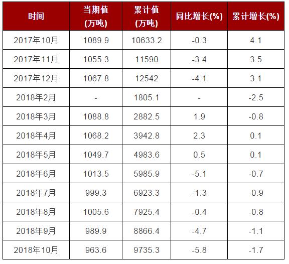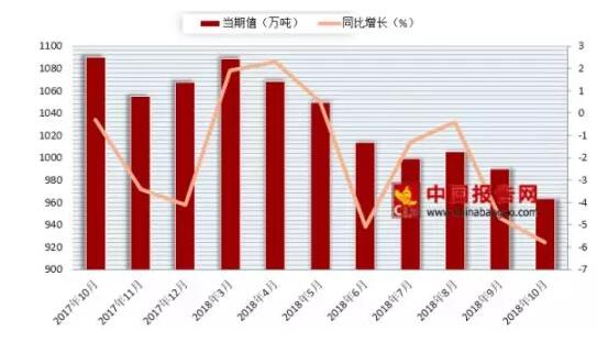 國家統(tǒng)計(jì)局:1-10月機(jī)制紙及紙板累計(jì)產(chǎn)量9735.3萬噸,下降1.7% 國家統(tǒng)計(jì)局?jǐn)?shù)據(jù)顯示: 1-10月我國機(jī)制紙及紙板累計(jì)產(chǎn)量達(dá)到9735.3萬噸,累計(jì)下降1.7%。 2018年1-10月我國機(jī)制紙及紙板產(chǎn)量情況:  2018年1-10月我國機(jī)制紙及紙板累計(jì)產(chǎn)量及增長(zhǎng)情況: