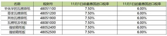 導(dǎo)語:從今年11月1日起,國務(wù)院決定降低1585個(gè)稅目工業(yè)品等商品進(jìn)口關(guān)稅稅率,其中瓦楞及箱板紙的最惠國進(jìn)口關(guān)稅稅率由7.5%降至6%,有利于降低進(jìn)口商成本,緩解經(jīng)濟(jì)壓力。