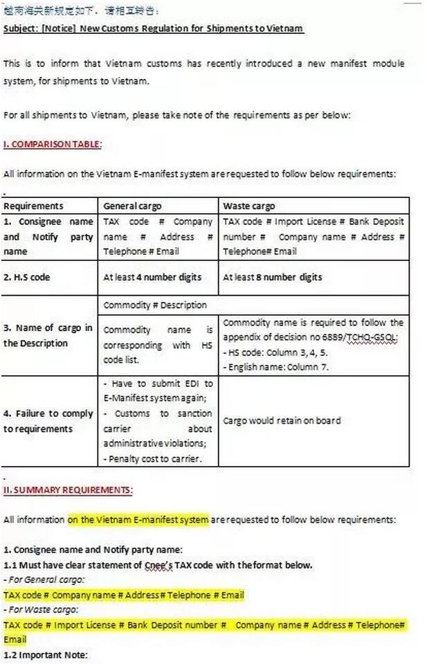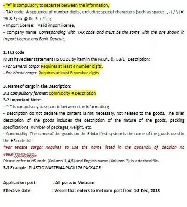 收貨人處必須有明確的收貨人稅號聲明: 區(qū)別于一般貨物,廢料格式:稅號#進口許可證#銀行存款號#公司名稱#地址#電話#電子郵件 重要提示: -“#”是必須分開的資料; -稅號:一串數字,不包括特殊字符(如空格)。,-)/\(=!)“%&*;<>@&|?:+"'." -進口許可證:有效進口許可證; -公司名稱:與稅法相對應,必須與進口許可證和銀行存款顯示的一致。 2 HS編碼提供上:一般貨物只需要4位,而廢料要求最少8位數字。 3 貨物名稱說明: 強制性格式:商品編號說明 重要提示: -“#”是必須分開的資料; -說明不申報內容沒有必要,與貨物無關。貨物的簡要說明包括貨物性質的說明、包裝規(guī)格、包裝件數、重量等。 -商品:電子艙單系統(tǒng)上的貨品名稱為“海關編碼清單”內使用的貨品名稱。 *廢物:需要使用第6889/TCHQ-GSQL號決定附錄所列的名稱。 請參考附件中的HScode(第3、4、5欄)和英文名稱(第7欄)。 例子:塑料廢料#44PKG#176包裝