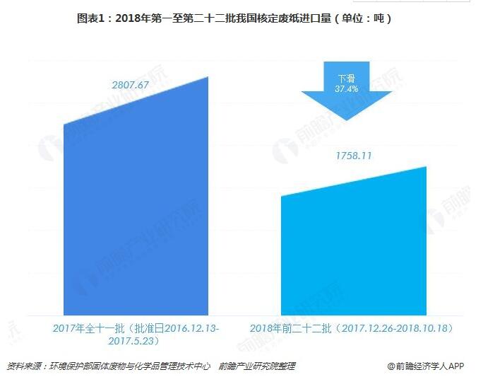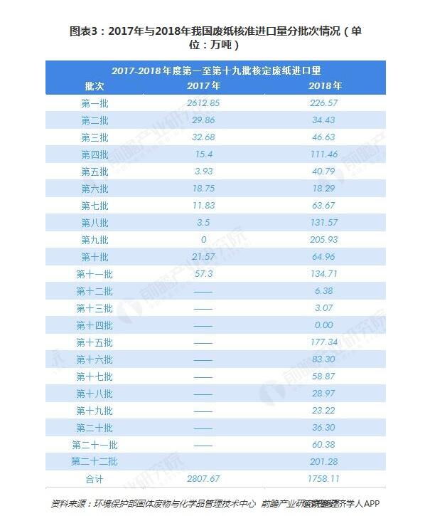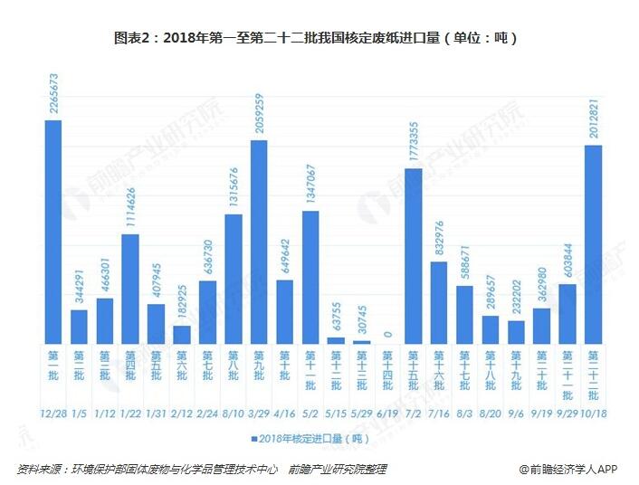2018年10月18日,環保部公示了2018年第二十二批固體廢物原料進口許可證獲批名單。此批名單一共增加了4家新審批廢紙加工利用企業,分別為江蘇富新紙業有限公司、江蘇京環隆亨紙業有限公司、廣東華泰紙業有限公司、浙江上游紙業有限公司。2018年前二十二廢紙審批總額度為1758.11萬噸較2017年下滑37.4%。