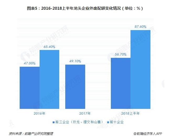 具體來看,2018年以來雖然造紙龍頭企業的進口總額度也呈下降趨勢,但是龍頭企業進口配額在全國總額度中的比重明顯提升,據統計2018上半年前三家(玖龍、理文山鷹)配額從2016年47.0%提升到2017年49.1%以及2018年的56.7%,前十企業占比從2016年的65.4%上升至87.6%。獲得配額的企業數由160家下降至目前的77家。