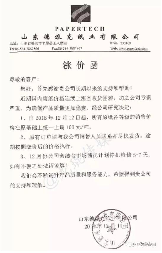山東德派克紙業(yè)有限公司 自2018年12月12日起,所有原紙各等級(jí)的銷售價(jià)在原基礎(chǔ)上統(tǒng)一上調(diào)100元/噸。12月份,公司會(huì)結(jié)合市場(chǎng)情況計(jì)劃停機(jī)檢修5-7天;