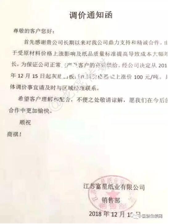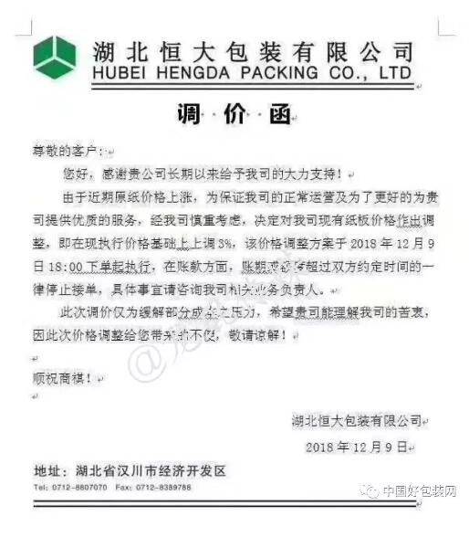 價(jià)格傳導(dǎo),湖北多家紙板廠漲價(jià)3% 同時(shí),在湖北地區(qū),多家紙板廠發(fā)布最新漲價(jià)函,表示將在原價(jià)格基礎(chǔ)上漲價(jià)3%,并對(duì)賬期、下單金額作出相關(guān)規(guī)定。 湖北合興包裝印刷有限公司 自2018年12月9日18:00起,紙板價(jià)格在現(xiàn)行價(jià)格基礎(chǔ)上上調(diào)3%。