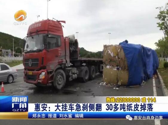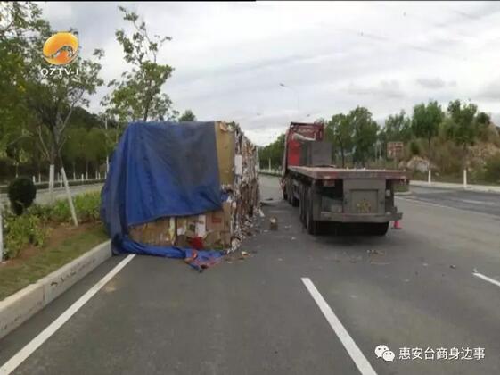 12月11日上午,泉州市惠安縣城至動車站快速通道上,一輛大掛車側翻,車上的幾十噸貨物傾倒在路中央,所幸事發時沒傷及其它過往車輛。 事故地點位于惠安縣城至動車站快速通道壩下村路段。記者到達現場時,大掛車已經被吊起扶正,但象小山似的貨物還末清理,這些占據了近兩個車道的貨物是一些廢紙皮,前往惠安動車站和泉州方向的車輛只好減速慢行。大掛車司機介紹,車上裝載的廢紙皮有30多噸,打算從福州運往漳州一家造紙廠,清晨五點多,行駛到此處時,由于司機路況不熟,導致事故發生。  (記者):怎么側翻了? (大掛車司機陳師傅):就是那邊路面不平,有點溝,然后這樣打方向車子晃動,就翻了。 車子側翻后,陳師傅從車窗里爬出,所幸只是輕微受傷。他脫困后,一邊打電話給公司,一邊聯系救援車輛。上午九點多,大吊車來到現場,將大掛車吊起扶正,但由于車輛受損無法繼續行駛,只能等待公司派車來轉移貨物。據一旁的大吊車紀師傅介紹,這個路口彎太大,不熟悉路況的大貨車司機,一急打方向就容易發生側翻。