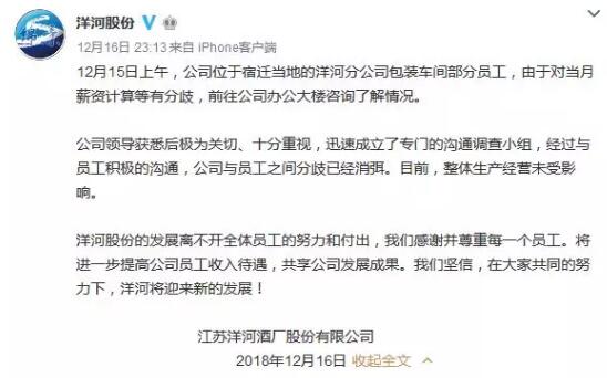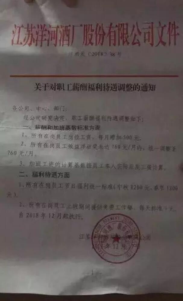 對于這一次包裝工的利益訴求,洋河酒廠做出了如下薪資調整,可謂誠意滿滿。 1、所有員工崗位工資每月增加500元。由原500元增加到1000元。 2、初級工效益浮動獎和高級工同等待遇,每月增加300元,由原460元增加到760元。未達到760元的同意調整到760元。 3、加班工資基數計算,按員工本人實際應發工資計算。 4、福利待遇方面。初級工節日福利與高級工中秋、春節節日福利標準一致,中秋1200元,春節1800元,平均到每月每人月增加175元。所在在崗職工上班期間免費工作餐,每天標準9元每個人。