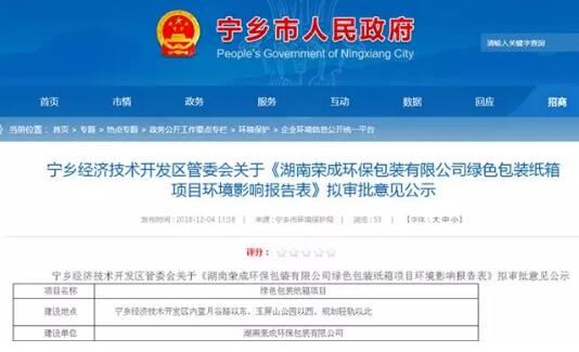 導語:近期,湖南省寧鄉經濟技術開發區管委會公示了關于《湖南榮成環保包裝有限公司綠色包裝紙箱項目環境影響報告表》擬審批意見。