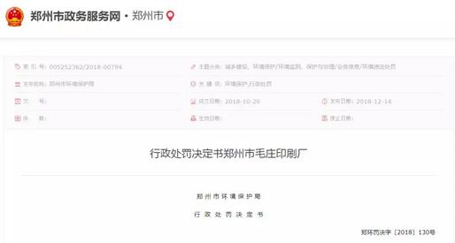 導(dǎo)語(yǔ):河南省鄭州環(huán)境保護(hù)局于12月14日發(fā)布了行政處罰決定書(shū),因發(fā)現(xiàn)鄭州市毛莊印刷廠產(chǎn)生含有揮發(fā)性有機(jī)物廢氣的印刷車(chē)間未完全密閉,罰款6萬(wàn)元。