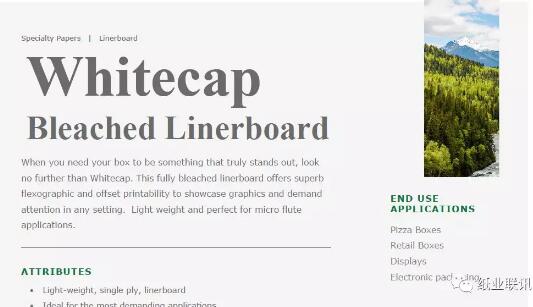 在NDPaper官網(wǎng)介紹漂白牛皮箱板紙的文件中,公司表示產(chǎn)品是一種單層低克重紙板,適用于制作披薩盒、零售包裝盒等終端應(yīng)用場(chǎng)合。產(chǎn)品克重為15-lb、18-lb、21-lb以及24-lb,即74gsm、89gsm、104gsm以及118gsm。