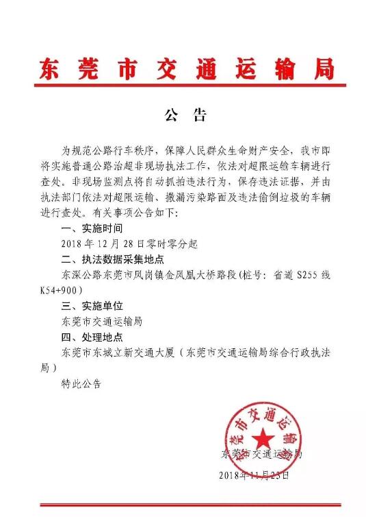 東莞市交通運輸局發(fā)布公告,將于12月28日零時零分起,開始實施普通公路治超非現(xiàn)場執(zhí)法工作,依法對超限運輸車輛進行查處!