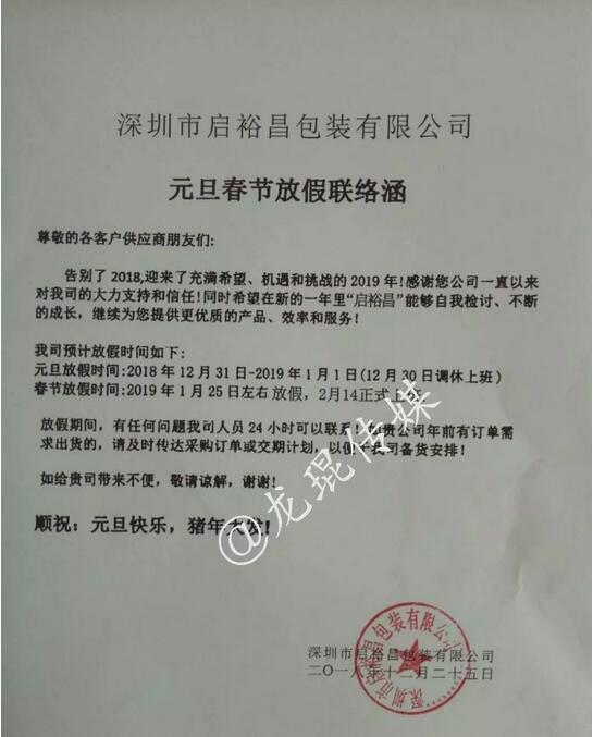 日前,深圳市啟裕昌包裝有限公司發(fā)布了放假通知。其中,春節(jié)放假時間為2019年1月25日-2月14日。據(jù)了解,深圳市啟裕昌包裝有限公司經(jīng)營范圍包括紙制品銷售、國內(nèi)貿(mào)易、貨物及技術(shù)進(jìn)出口。