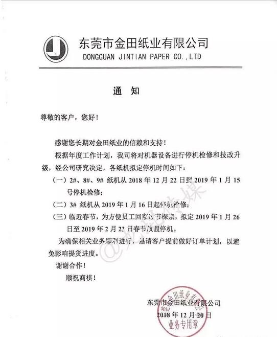 12月20日,東莞市金田紙業(yè)有限公司在發(fā)布停機(jī)檢修通知時也稱,擬定2019年1月26日至2019年2月22日春節(jié)放假停機(jī)。