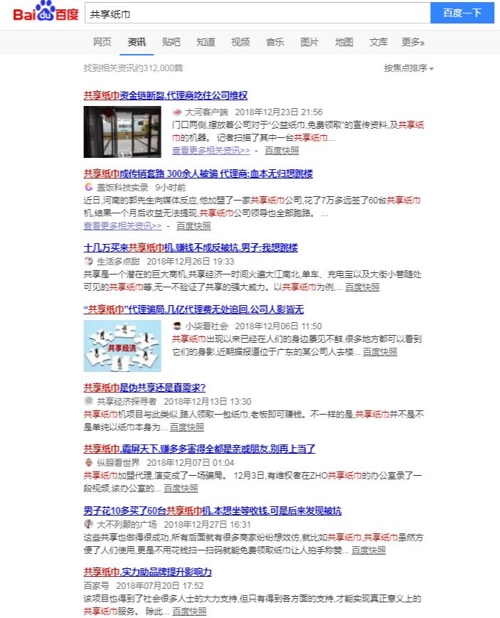 小黃車ofo黃了,摩拜單車大裁員,共享汽車涂歌“人去樓空”,最近一段時間,曾經(jīng)被炒的沸沸揚揚的共享經(jīng)濟(jì)遇到了“全線潰敗”的現(xiàn)實。在造紙行業(yè)里炒起來的“共享紙巾”,也正在露出敗相。 通過百度搜索關(guān)鍵詞“共享紙巾”,顯示的幾乎全部是被騙的新聞。