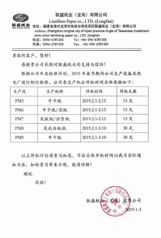 1月3日,福建最大的包裝紙生產企業聯盛紙業(龍海)有限公司發布了2019年春節期間停機通知,公司五臺紙機將從2月1日起全部停機,其中兩臺產量最大的紙機PM8和PM9將停產38天。與2018年春節相比,聯盛紙業的2019年春節總停產時間有所增加。