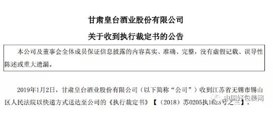 2019年1月3日晚,甘肅皇臺酒業股份有限公司(簡稱“*ST皇臺”)發布公告稱,公司收到法院送達的《執行裁定書》,將被強制執行償還無錫市梅林彩印包裝廠到期債權1362.29萬元。