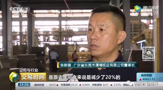 廣東省東莞市清埔紙業(yè)有限公司董事長張新雄:整體訂單在下半年同比減少了20%。整個上游降價,是因?yàn)檎w下游的訂單逐步減少,也造成了上游的產(chǎn)能過剩,逐步在降價。訂單減少確實(shí)是會影響到我們這邊,我們也感受到員工的開工率沒那么高了。
