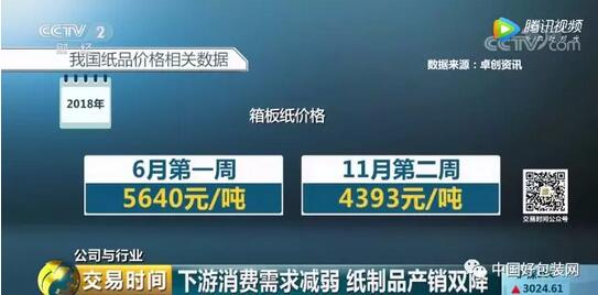 據(jù)數(shù)據(jù)顯示,2018年全國紙品價格整體呈下行走勢,以價格降幅較大的箱板紙為例,價格最高點(diǎn)出現(xiàn)在去年6月第一周為:5640元/噸,最低點(diǎn)出現(xiàn)在11月第二周為4393元/噸。