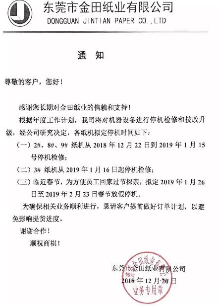 另,根據東莞金田紙業此前發出的春節停機通知,東莞金田紙業將于1月26日(臘月二十一)至2月23日(正月十九)放假停機,時長29天。