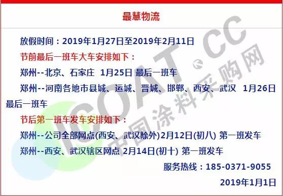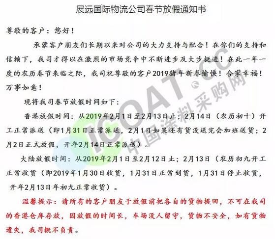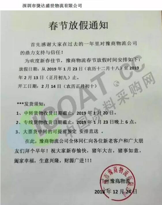 導語:年關將近,很多物流公司都陸續發布了2019年春節停運通知。大部分物流公司從1月20日起開始放假,部分甚至在1月10日、12日就停止收貨。有包裝廠也發出通知,春節將至,工廠放假,物流、運輸休息!要下單的老板們,抓緊啦!