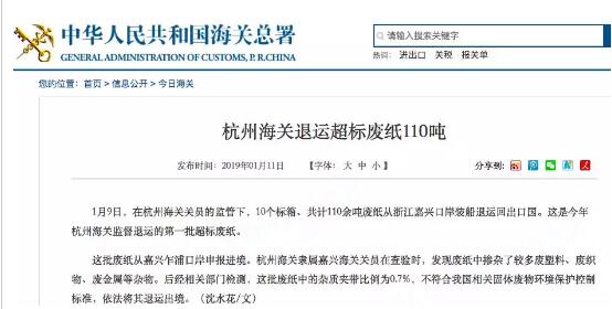 1月9日,在杭州海關(guān)關(guān)員的監(jiān)管下,10個(gè)標(biāo)箱、共計(jì)110余噸廢紙從浙江嘉興口岸裝船退運(yùn)回出口國。這是今年杭州海關(guān)監(jiān)督退運(yùn)的第一批超標(biāo)廢紙。