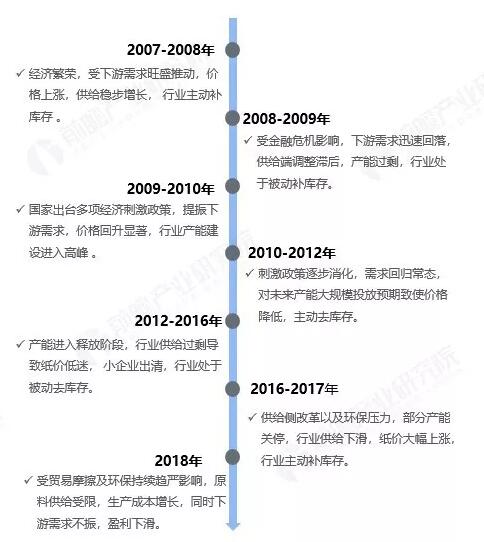 行業周期性波動,2018年行業景氣指數下降 造紙行業是典型的周期性行業,容易受到宏觀經濟的影響,具備長期的波動性。行業供需方面,產能建設具有2年左右的周期;同時,需求也受到節日、季節、學汛的影響,在一年內形成常規性的波動,因此造紙行業具有典型的周期屬性。 從大周期來看,2007年至今造紙行業經歷了完整的波動周期,進入2018年以后,由于受到中美貿易摩擦導致原材料價格攀升,以及下游需求疲軟導致價格走低等因素的影響,促使行業企業盈利下滑,行業整體景氣度不斷走低。