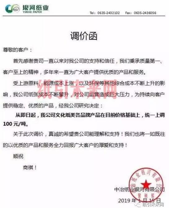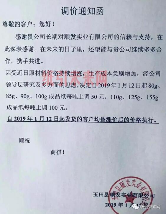 山東天和紙業有限公司:近期我公司持續受原材料、能源等多種因素影響,生產成本升幅較大,為確保貴我雙方互共贏,產品品質持續穩定,經公司董事會研究決定:自2019年1月13目起,我司生產的低定量文化用紙:本白雙面膠版印刷紙及薄冊紙在原價格上調100元/噸,高白和深黃的雙面膠版及薄冊紙在原價格上調200元/噸。