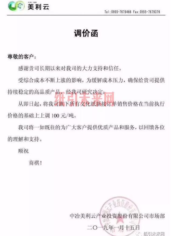 廣東松煬再生資源股份有限公司:由于目前原材料不斷漲價造成我司生產成本均在大幅攀升,為了保證產品質量,經公司協商決定價格調整如下:1.從2019年1月13日起,我司生產的美陽牌灰底涂布白板紙在原有價格基礎上上調50元/噸。2.所有未完成訂單(包括此前預付款未完成的訂單)都在此上調范圍內。