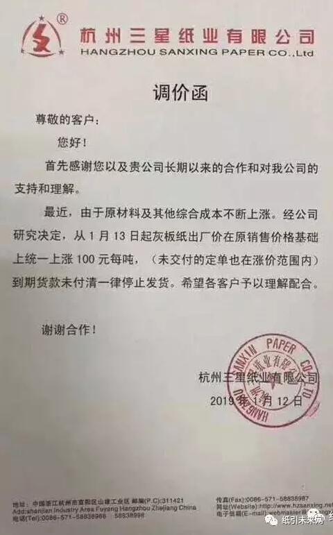 杭州三星紙業有限公司:最近,由于原材料及其他綜合成本不斷上漲。經公司研究決定,從1月13日起灰板紙出廠價在原銷售價格基礎上統一上漲100元每噸,(未交付的定單也在漲價范國內)到期貨款未付清一律停止發貨。希望各客戶予以理解配合。