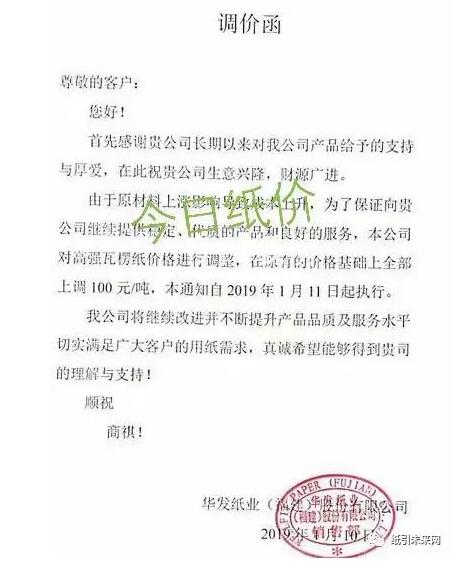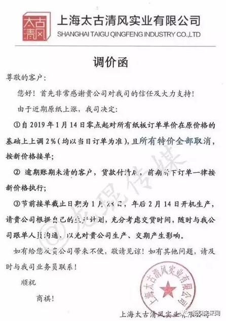 上海太古清風實業有限公司:自2019年1月14日零點起,所有紙板訂單單價在原價格的基礎上上調2%,且所有特價全部取消。節前接單截止日期為1月24日,年后2月14日開機生產。
