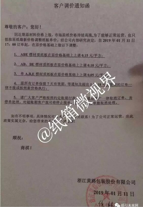 二、又4家紙板廠發布漲價函,貨款逾期及超賬期客戶取消并停單 1月11日,浙江黃路包裝股份有限公司發布漲價函:自2019年1月11日17:00起,ABE楞材質紙板在原價格基礎上上調0.15元/平方;AB、BE楞材質紙板在原價格基礎上上調0.10元/平方;單A、B、E楞材質紙板在原價格基礎上上調0.05元/平方。貨款逾期客戶一律取消訂單,并停單處理。超賬期客戶停止接單,并對之前訂單做取消處理。