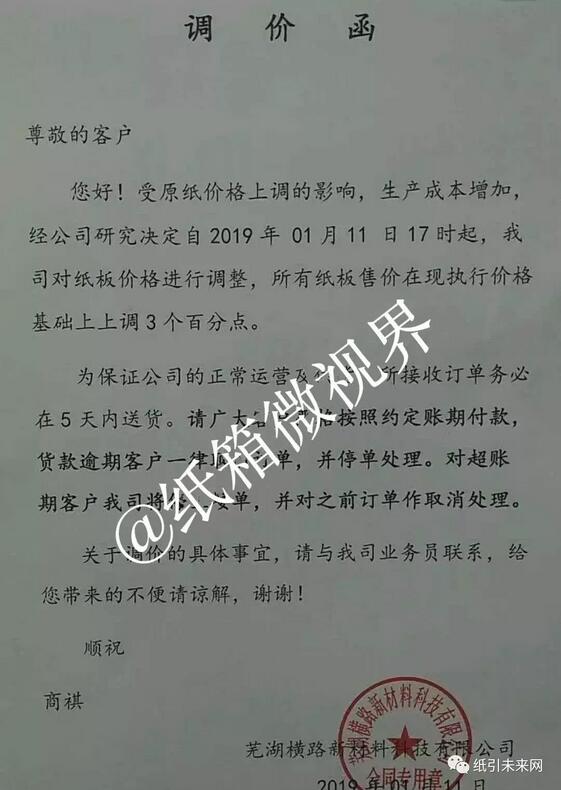 1月11日,蕪湖橫路新材料有限公司發布漲價函:1月11日17點起,所有紙板售價在現執行價格基礎上上調3個百分點。貨款逾期客戶一律取消訂單,并停單處理。超賬期客戶停止接單,并對之前訂單做取消處理。