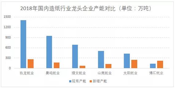 供給側改革效果顯著,行業集中度不斷提高 近兩年,受國家供給側改革政策以及環保趨嚴政策影響,造紙行業規模以上企業數量在2015年出現顯著減少,后續兩年也同樣保持逐年減少的趨勢。2017年,中國造紙行業規模以上企業數量為2754家,預計在原材料供給收緊,市場下游需求疲軟的影響下,2018年仍有部分落后企業會被市場所淘汰。 從行業集中度來看,根據中國造紙協會數據,自2011年以來,我國造紙行業市場集中度不斷攀升,按照這一趨勢預計在2018年CR10將達到40%以上;CR5將接近30%。 龍頭企業產能優勢突出,箱板/瓦楞紙是競爭重點 造紙行業中,產能的大小直接決定了企業競爭能力的高低。目前,國內造紙產能排名靠前的企業主要包括玖龍紙業、晨鳴紙業、理文造紙、山鷹紙業、太陽紙業以及博匯紙業等企業。在現有產能方面,玖龍企業遙遙領先去其他企業,具有較大的競爭優勢。而在新增產能方面,玖龍紙業、太陽紙業和博匯紙業新增產能均在200萬噸以上,而理文紙業新增產能最少,僅為74萬噸。