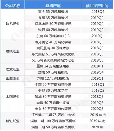 事實上,從2016年起,造紙行業在供給側改革的壓力下,行業小產能不斷出清;與此同時,在環保大勢的催化下,原料供應收緊,推動原料價格上漲,小企業盈利能力受損,進一步加快產能出清。龍頭企業基于資金與資源優勢,具備強大的原料獲取能力,產能投放持續推進,競爭優勢顯著。 更具體的,在企業的產能布局上,箱板紙和瓦楞紙是企業的產能布局重點,這與市場需求密切相關。2017年,國內箱板和瓦楞紙的生產量分別為2385萬噸和2335萬噸,產量占比均在20%以上;而消費量也呈同樣的特征?梢,箱板和瓦楞紙是各大企業目前的競爭重點。 此外,從各龍頭企業未來2-3年的投產計劃來看,廢紙系的箱板、瓦楞紙產能投放較多,而文化用紙由于需求較為剛性,產能投放相對維持穩定。可以預計,未來箱板、瓦楞紙細分紙種的未來競爭將更加激烈。