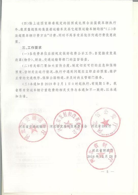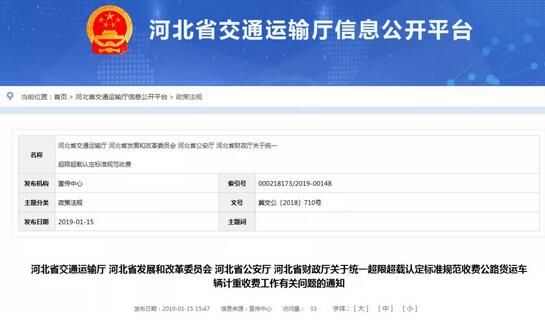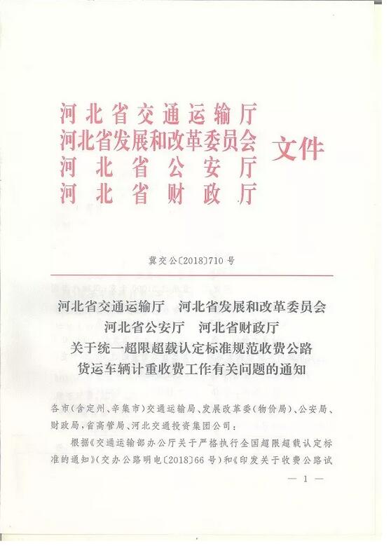 為打擊非法超限超載運輸行為,進一步加強河北省收費公路超限超載治理工作,近日,河北省交通運輸廳、省發(fā)展和改革委員會、省公安廳、省財政廳四部門聯(lián)合印發(fā)《關(guān)于統(tǒng)一超限超載認定標準規(guī)范收費公路貨運車輛計重收費工作有關(guān)問題的通知》(以下簡稱《通知》),自2019年2月1日零時起執(zhí)行。