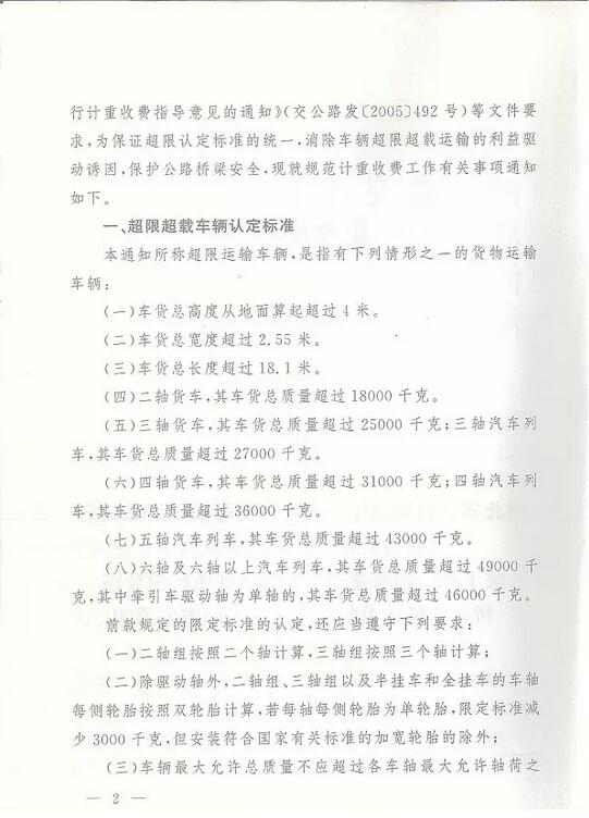 《通知》主要對超限超載車輛計重收費中車貨總重量限值部分進行了調(diào)整,其他部分計費方式和標準均未變化;對大件運輸車輛的計費方式有所調(diào)整。 超限超載車輛認定標準 本通知所稱超限運輸車輛,是指有下列情形之一的貨物運輸車輛: (一)車貨總高度從地面算起超過4米。 (二)車貨總寬度超過2.55米。 (三)車貨總長度超過18.1米。 (四)二軸貨車,其車貨總質(zhì)量超過18000千克。 (五)三軸貨車,其車貨總質(zhì)量超過25000千克;三軸汽車列車,其車貨總質(zhì)量超過27000千克。 (六)四軸貨車,其車貨總質(zhì)量超過31000千克;四軸汽車列車,其車貨總質(zhì)量超過36000千克。 (七)五軸汽車列車,其車貨總質(zhì)量超過43000千克。 (八)六軸及六軸以上汽車列車,其車貨總質(zhì)量超過49000千克,其中牽引車驅(qū)動軸為單軸的,其車貨總質(zhì)量超過46000千克。