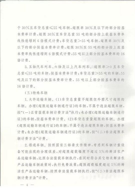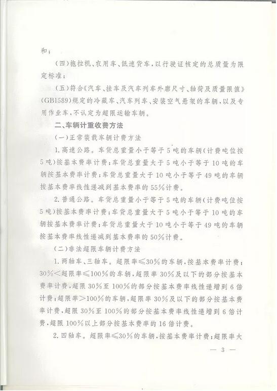 2綠通車輛 按照國家三部委文件精神,考慮到車輛計重設(shè)備可能出現(xiàn)的合理誤差,對超限超載幅度不超過5%的鮮活農(nóng)產(chǎn)品運輸車輛,比照合法裝載車輛執(zhí)行,在同時符合其它相關(guān)鮮活農(nóng)產(chǎn)品運輸車輛政策時,執(zhí)行免費政策; 超限超載幅度超過5%的鮮活農(nóng)產(chǎn)品運輸車輛,按照非法裝載車輛執(zhí)行,按“(二)非法超限車輛計費方法”計費。 本通知自2019年2月1日0時起執(zhí)行,有效期5年。我省原有貨運車輛計重收費的相關(guān)文件與本通知不一致的,以本通知為準。 文件如下: