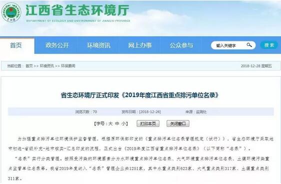 近日,江西省生態環境廳正式印發《2019年度江西省重點排污單位名錄》。《名錄》實行分類管理。按照受污染的環境要素分為水環境重點排污單位名錄、大氣環境重點排污單位名錄、土壤環境污染重點監管單位名錄等。江西省2019年度納入“名錄”管理企業共1251家,其中水重點類別623家、大氣重點類別317家、土壤重點類別311家。其中,62家造紙廠上了該名錄。  江西理文造紙有限公司 宜春市袁州區泉灣造紙廠 萬載縣恒達造紙廠 宜春市豐得造紙有限公司 宜豐縣洞山造紙廠 宜豐縣天馬造紙廠 江西晨鳴紙業有限責任公司 南昌恒川紙業有限公司 江西特種紙業有限責任公司 南昌愛輝紙業有限公司 南昌旺鑫紙業有限公司 江西恒澤紙業有限公司 江西柯美紙業有限公司 上栗縣萍鋒紙業有限公司 江西省泰盛紙業有限公司 江西永泰紙業有限公司 江西五星紙業有限公司 九江銀豐紙業有限公司 瑞昌市瑞翔再生紙業有限責任公司 江西晨陽紙業有限公司 瑞金晶山紙業有限公司 信豐榮興紙業有限公司 于都縣正億紙品紙業有限公司 贛州華勁紙業有限公司 興國縣華倫紙業有限公司 吉安豐順紙業有限公司 峽江縣富興紙業有限公司 江西省新洪興紙業有限公司 峽江縣金元紙業有限公司 泰和縣金惠紙業有限責任公司 江西立峰紙業有限公司 江西永新南方紙業有限公司 宜春市秀江紙業有限公司 江西省梁氏紙業有限公司 江西三森紙業有限公司 江西省奉新縣季布諾紙業有限公司 江西富宏紙業有限公司 萬載縣金信紙業有限公司 江西省萬載縣新力紙業有限公司 江西省萬載縣萬盛紙業有限公司 萬載縣金柯紙業有限公司 萬載縣康強紙業有限公司 宜豐縣明晟紙業有限公司 宜豐縣金億紙業有限公司 江西省上高瑞峰紙業有限公司 江西春源紙業有限責任公司 江西雙林紙業有限公司 江西富臨紙業有限公司 撫州銀豐紙業有限公司 南城縣永泰紙業有限公司 江西鑫福源紙業有限公司 江西南城金恒紙業有限公司 江西金安紙業有限公司 廣昌縣昌圣再生紙業有限公司 宜黃縣星泰紙業有限公司(新廠) 江西樂門紙業有限公司 上饒市廣豐區裕豐紙業有限公司 上饒市蘆林紙業有限公司 江西三禾紙業有限公司 江西省順豐紙業有限責任公司 江西順達紙業有限責任公司 鄱陽縣創新紙業有限公司 江西省生態環境廳明確,納入了《名錄》的企業事業單位,應當根據《企業事業單位環境信息公開辦法》、自行監測指南、監測技術規范等環境管理要求開展自行監測工作并公布監測信息,接收公眾監督,落實企業主體責任,提升企業的環保意識。江西省各級生態環境行政主管部門將加強“名錄”內企業的環境管理力度,定期開展監督性監測工作并公布監測結果,督促企業做到達標排放。