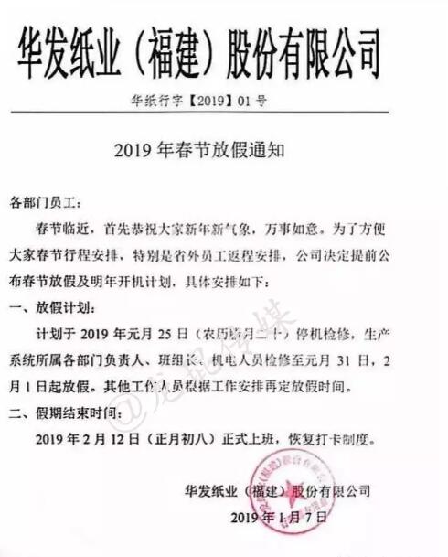 而在此前的1月7日,華發紙業(福建)股份有限公司也稱,將從2月1日起開始放假,2月12日正式上班。