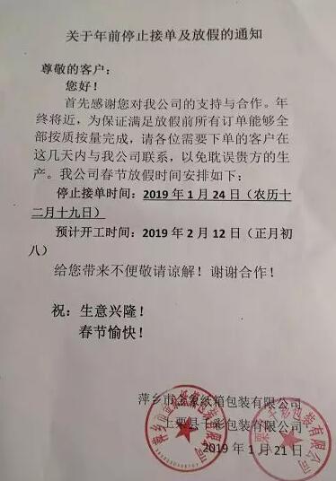 臺州市東奇包裝有限公司: 2019年1月19日(農歷十二月十四)停止接單。 2019年2月15日(農歷正月十一)正常開工。