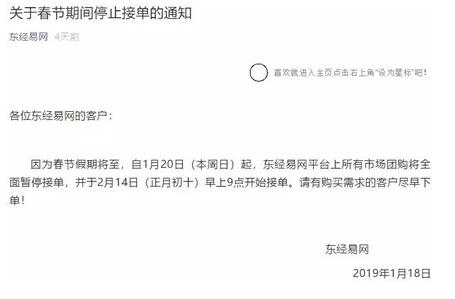 東經易網:自1月20日起,東經易網平臺上所有市場團購將全面暫停接單,并于2月14日(正月初十)早上九點開始接單。